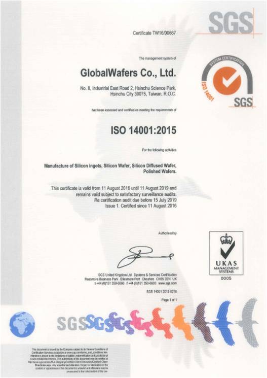 2016/08 ISO 14001:2015環境管理系統認證通過