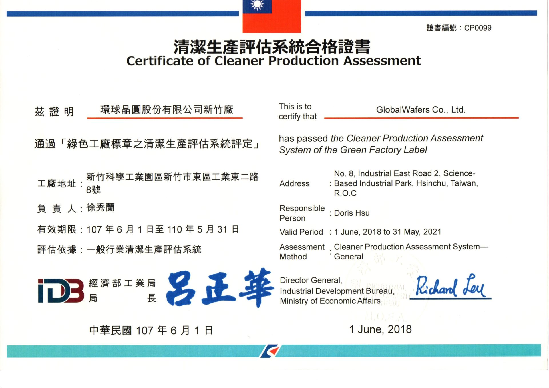 2018/06 環球晶圓通過綠色工廠標章之清潔生產評估系統之評定