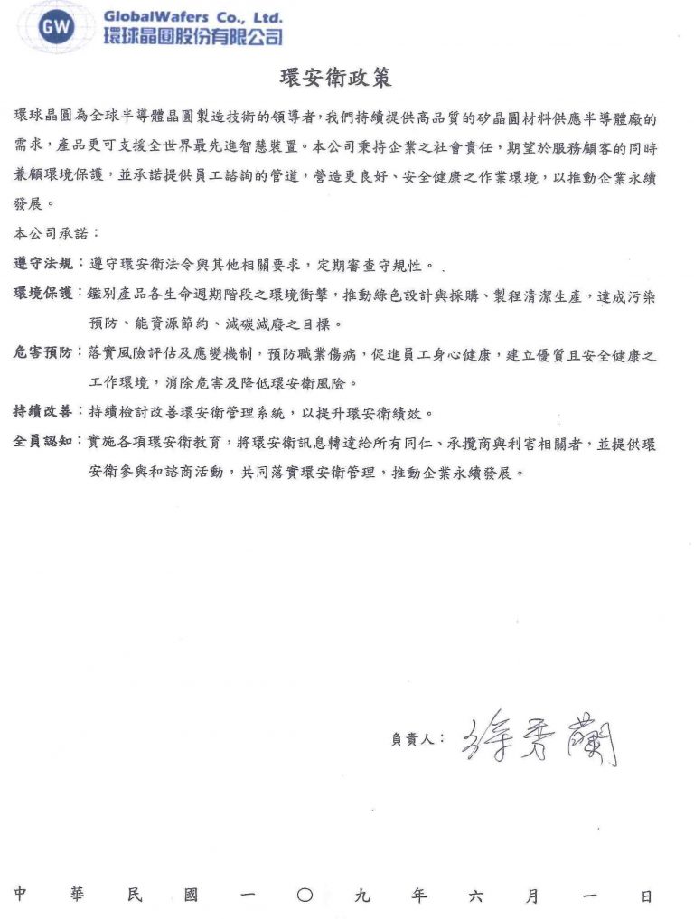 環球晶圓以提供安全、健康、舒適的工作環境為目標,為建構安全的工作環境,除遵守當地相關安全衛生法規外,並藉由審查、稽核、溝通及教育訓練,使全體同仁參與安全、衛生管理活動,適時採取適當之矯正措施,持續改善,以保障員工、承攬勞工及相關第三者生命安全與健康,創造永續經營的環境。