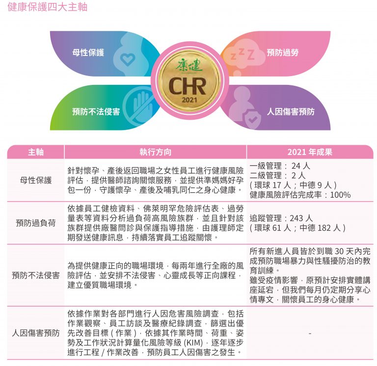 員工是環球晶圓最寶貴資產,我們致力於營造安全舒適的工作環境,並視員工健康為企業邁向成功及永續發展的關鍵要素,以我們台灣區為例,廠區內設置醫護室,配置專任護理師與特約職業醫學科醫師,持續推動母性保護、人因傷害預防及預防過勞、預防不法侵害之四大主軸,守護同仁的身心健康,透過多元的健康照護方案、辦理健康講座及各類型的健康促進活動,2021 年環球晶圓更榮獲《康健雜誌》CHR 健康企業公民許諾企業的認證標章,致力打造幸福健康職場標竿的目標。