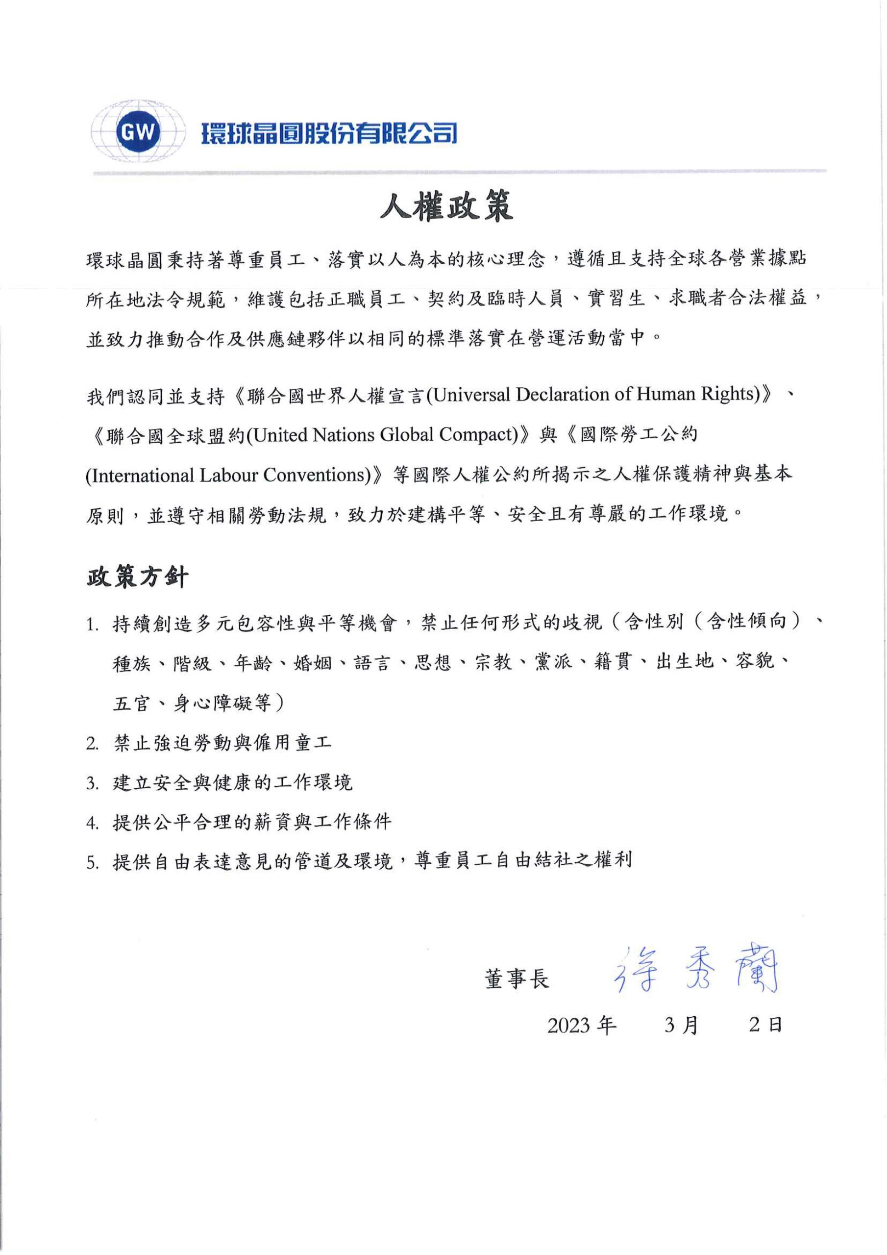 多元的員工組成是環球晶圓永續發展的重要因素之一,環球晶圓的據點散布於世界各地,以「打造友善職場」的概念,不因性別、年齡、族群給予差別待遇,除了提供友善的工作條件,也關心社會與環境的和諧發展。